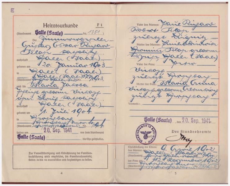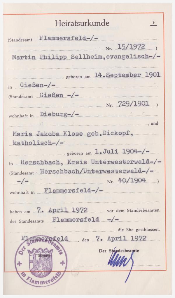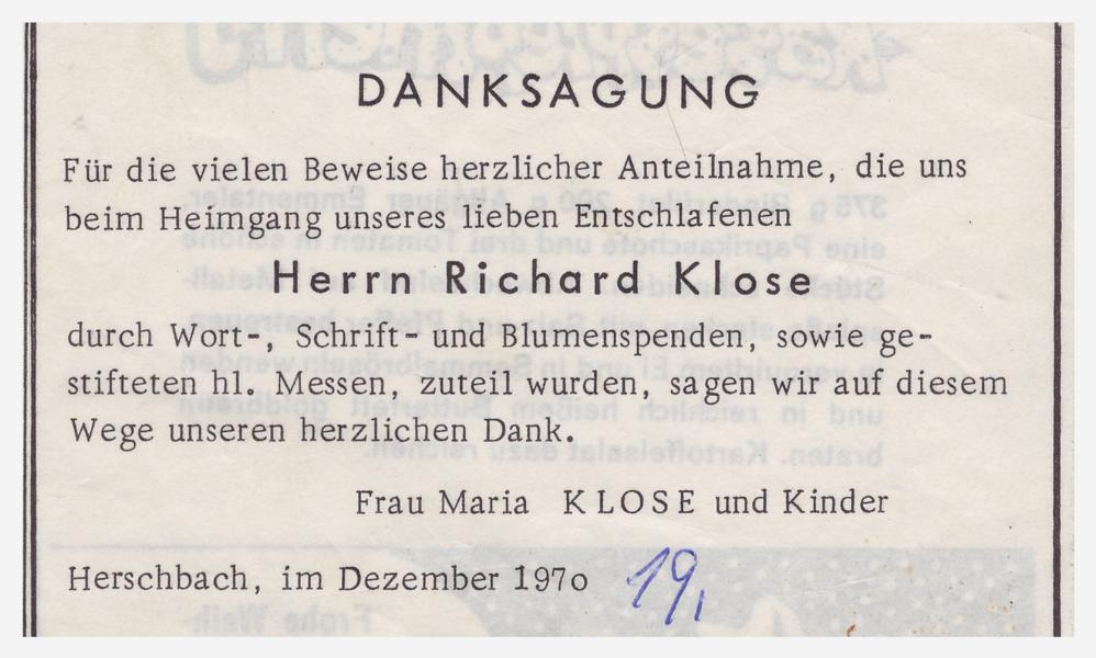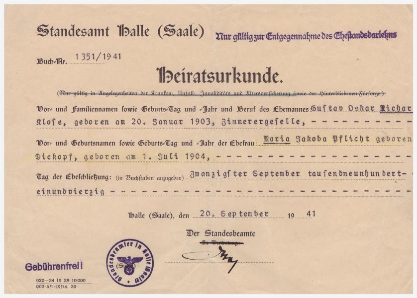 Am 2.9.1941 Heirat mit Richard Klose aus Halle/Saale,er starb am 19.12.1970 in Selters