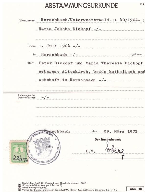 Geburtsurkunde, wurde als Tochter von Peter Paul Dickopf und Maria Theresia Dickopf geb. Altenkirch an 1.7.1904 in Herschbach geboren